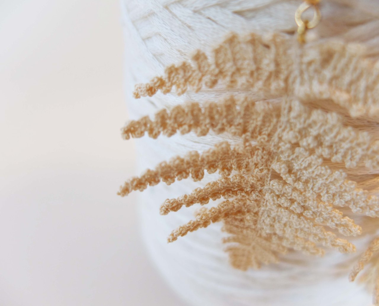 Ocre, blanc cassé ou vert mousse, les fougères sont montées sur boucles d’oreilles.