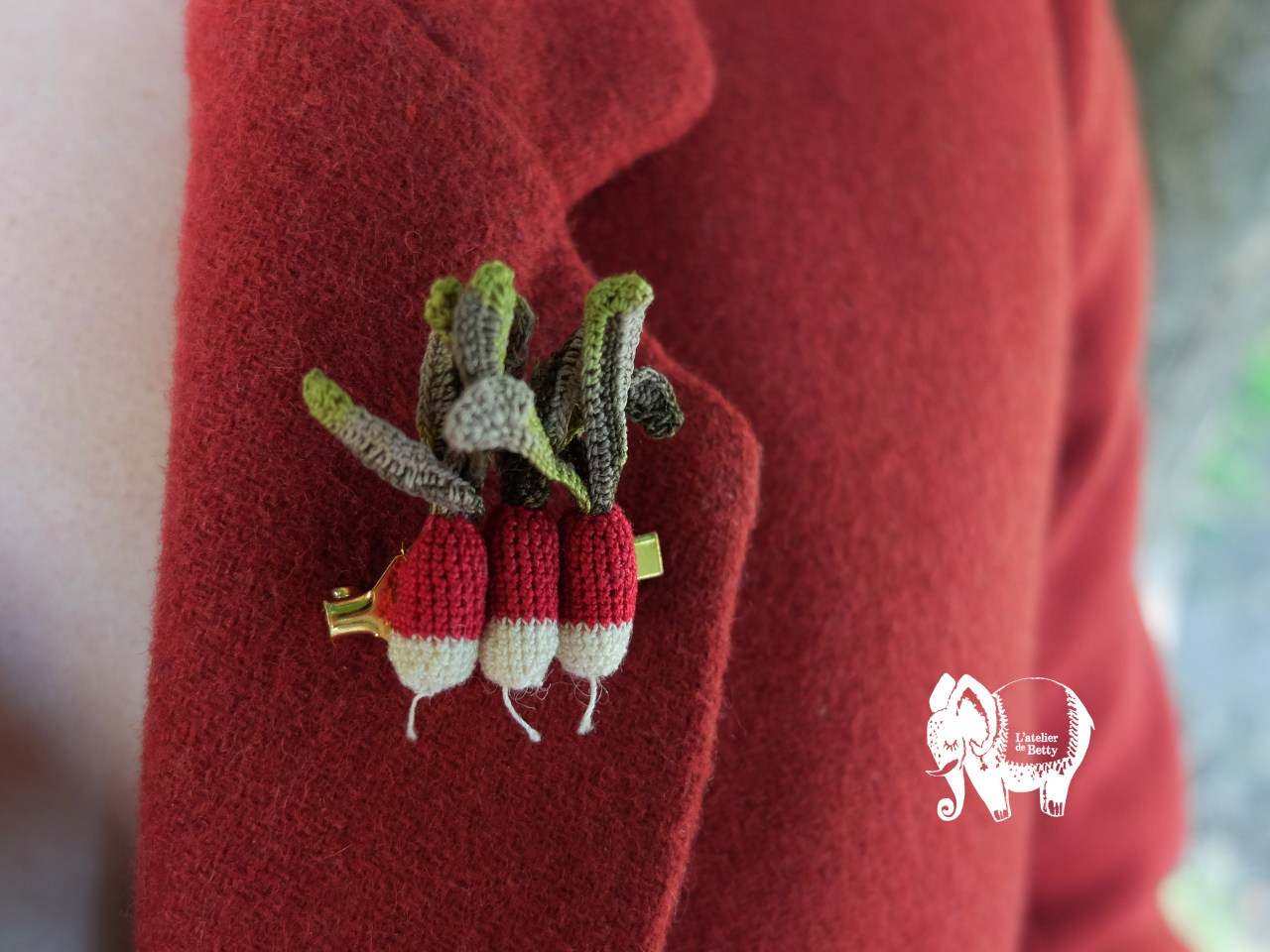 3 petits radis associés pour créer une broche aux couleurs vives. A greffer sur le col d’un chaud manteau d’hiver.