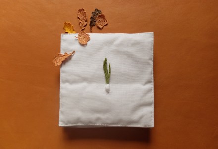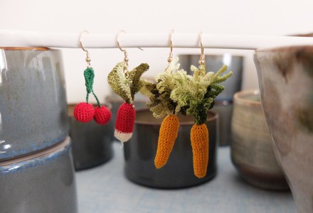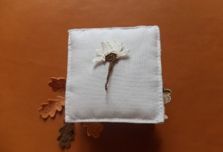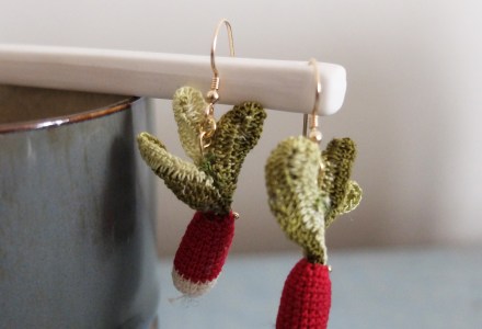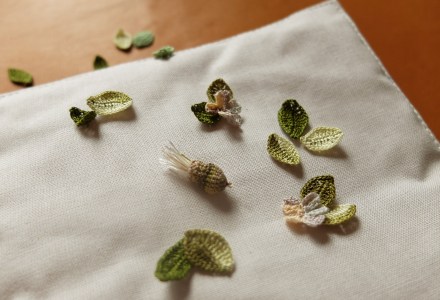 Créations textiles et travaux d’aiguilles contemporains montés sur bijoux.