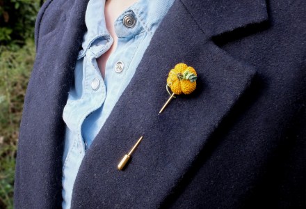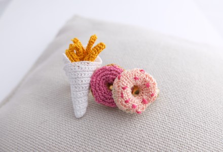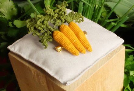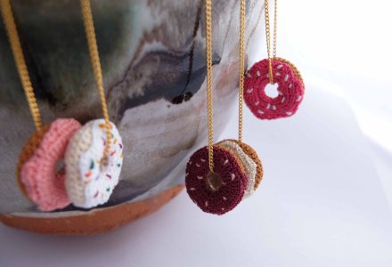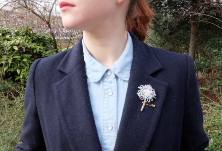 Créations textiles et travaux d’aiguilles contemporains montés sur bijoux.